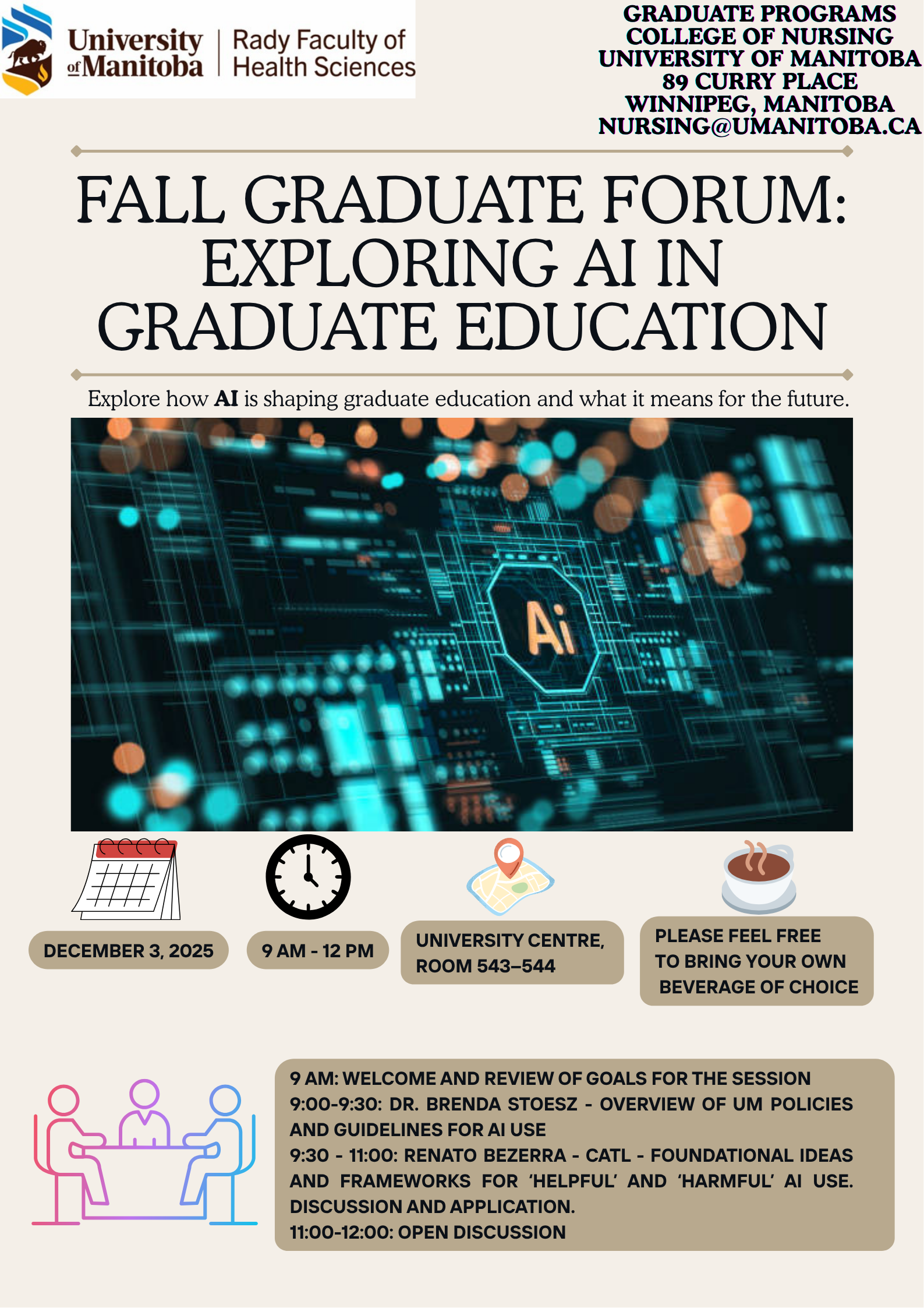Greetings everyone, Please find attached the agenda and poster for the Fall Graduate Faculty Forum on December 3, 2025. Best regards, ________________________________________________________________________________ Microsoft Teams Need help?https://aka.ms/JoinTeamsMeeting?omkt=en-US Join the meeting nowhttps://teams.microsoft.com/l/meetup-join/19%3ameeting_YmY2NzI2ODYtMDIxZi00MjM4LTk2MmQtMTE3OGU0Mzk5N2Mz%40thread.v2/0?context=%7b%22Tid%22%3a%224f80dd0b-338c-4e4c-8a14-90446962f7b8%22%2c%22Oid%22%3a%225ec8200c-4811-4dc8-8fb7-b621e9915378%22%7d Meeting ID: 276 952 896 903 2 Passcode: 8nE7yZ6C ________________________________ Join on a video conferencing device Tenant key: teams@cvi.umanitoba.ca Video ID: 113 323 402 1 More infohttps://pexip.me/teams/cvi.umanitoba.ca/1133234021 For organizers: Meeting optionshttps://teams.microsoft.com/meetingOptions/?organizerId=5ec8200c-4811-4dc8-8fb7-b621e9915378&tenantId=4f80dd0b-338c-4e4c-8a14-90446962f7b8&threadId=19_meeting_YmY2NzI2ODYtMDIxZi00MjM4LTk2MmQtMTE3OGU0Mzk5N2Mz@thread.v2&messageId=0&language=en-US ________________________________________________________________________________